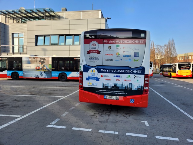 Er rollt …. wieder und wieder und wieder! Wir präsentieren „Hamburgs beste Arbeitgeber 2026“ einer breiten Öffentlichkeit in der Metropolregion Hamburg als herausragende Arbeitgeber im Hamburger Stadtverkehr und verhelfen so allen an sehr exponierten Stellen zu mehr Sichtbarkeit. Die Gewinner von „Hamburgs beste Arbeitgeber 2026“ werden auf der Hinterseite eines in der Hamburger Innenstadt auf wechselnden Strecken fahrenden Gelenkbusses gewürdigt.